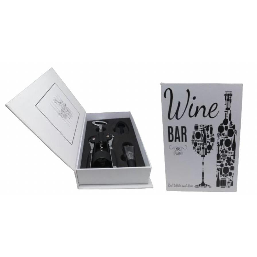 Especificações do Produto: Kit Vinho Abridor Saca Rolhas Tampa Dosador tipo Livro 5 Peças é composto por:KIT PARA VINHO COM 03 PEÇAS CAIXA LIVRO - ZQ213